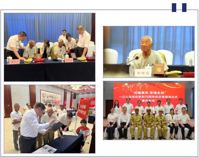 松柏凝翠寄哀思,丰碑巍峨铸忠魂。为了表彰为台州解放付出青春汗水的一江山战役参战老兵,椒江区退役军人事务局特意成立工作专班,远赴山东滨州惠民,在战役胜利70周年之际为参战老兵举行纪念章颁发仪式。6月17日,“戎耀惠民 军魂永驻”一江山岛战役胜利70周年纪念章颁发仪式惠民专场隆重举行。椒江区、惠民县退役军人事务局及惠民县档案馆领导,与参战老兵、烈士家属代表齐聚一堂,共同回溯那段波澜壮阔的烽火岁月,向英雄先辈致以最崇高的敬意。